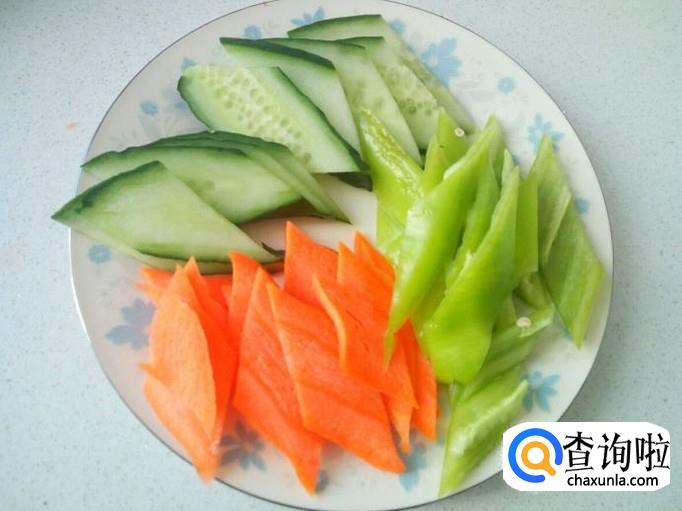 胡萝卜,青尖椒,黄瓜,用水洗净,切成片。切好葱,姜,蒜备用。