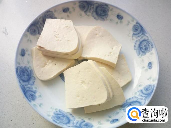 豆腐切成0.5公分左右厚,4公分大小的方块。新买回来的豆腐最好放置一天控水,或者用水焯一下,切时不易碎,不粘刀。
