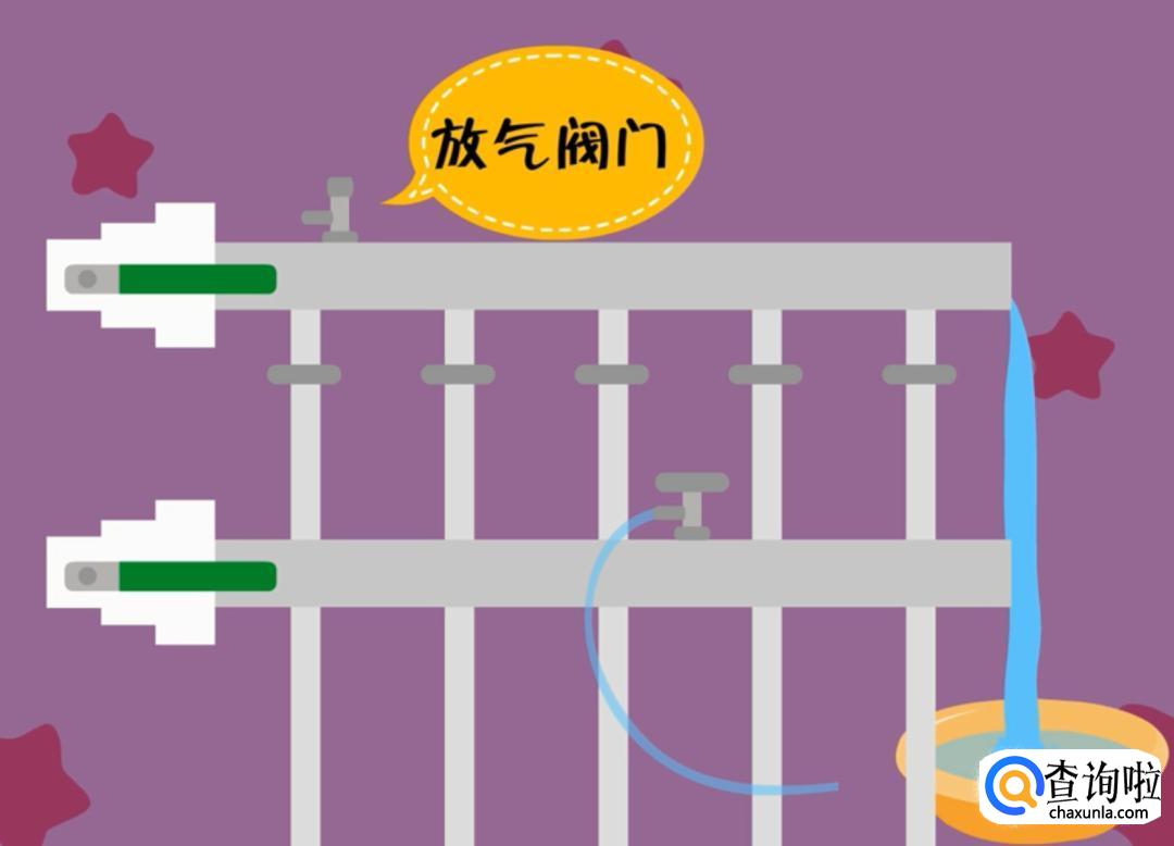 打开分水支路上的一组进水和回水阀门,然后再次打开分水器进水管上的放气阀门,同样直到放出的水不含气泡为止。