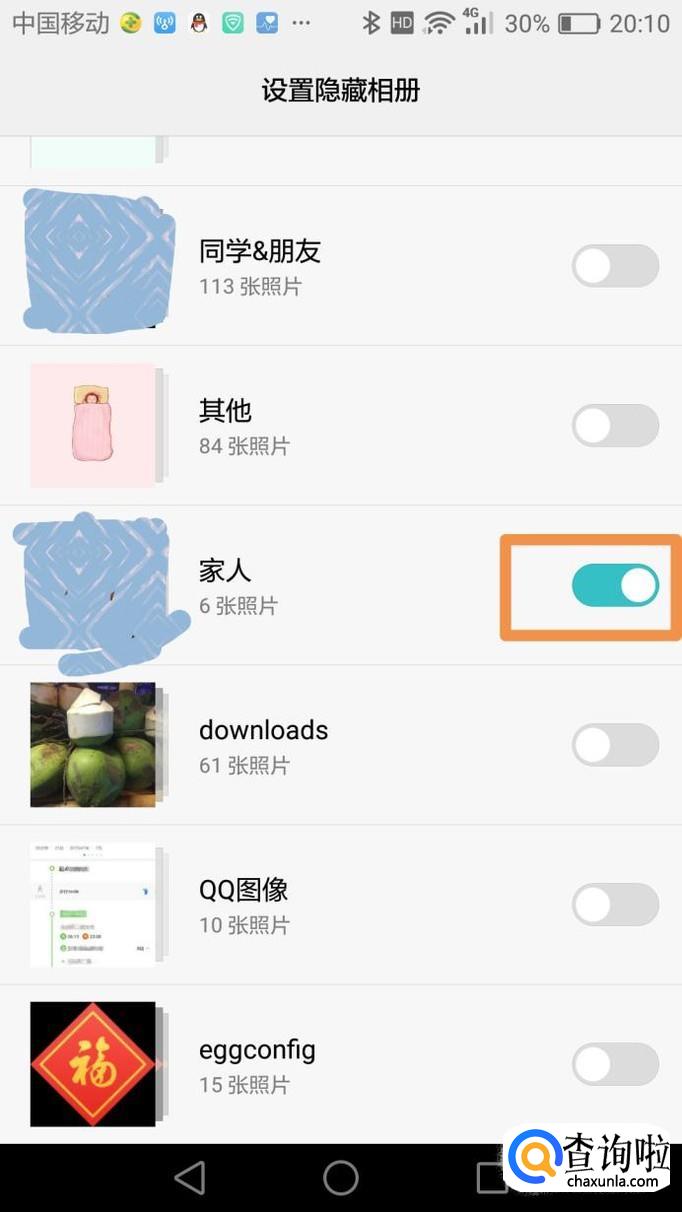 之前隐藏的相册右边是蓝色的按钮,如果想要恢复隐藏相册就将按钮向左划,使之变为灰色?