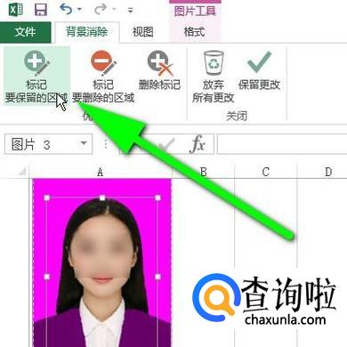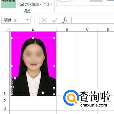 点击“删除背景”按钮,执行删除背景命令;这时,我们看证件照这里有一个调节框。在调节框外的图像呈紫色状态,紫色状态的表示要删除的;而在调节框内有部分图像呈紫色,有部分图像保留了照片原来的颜色。