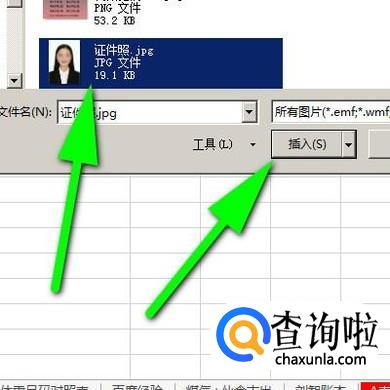 弹出插入图片对话框,我们在框中找到证件照;选中它,再点“插入”;该证件照图片即插入到了excel表格中。再把照片移到目标单元格上。