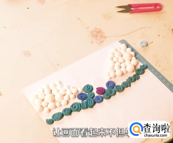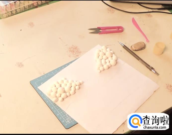 我们先准备一张硬纸,在纸上用铅笔轻轻画出图形的大概轮廓。然后我们开始做云朵,用大小不一样的圆球,拼接在一起,就成了一朵一朵的云朵。