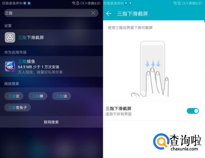 在屏幕搜索“三指下滑截屏”,进入设置界面,打开右图所示按钮即可。