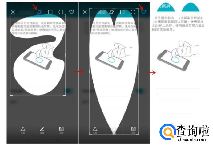 l 局部截屏-敲一下画一个封闭的图案,可以选择你画的图形截屏(图左),也可以选择预设的图形截屏(图中),完成(图右)