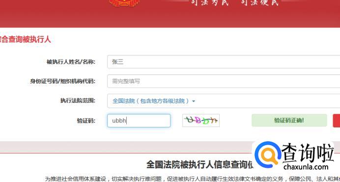 当然了我们也可以全国法院失信被执行人名单信息公布与查询网站进行查询。在上一部显示结果的页面右下角会看到“人民法院网”,点击进入。然后点击首页的“综合查询被执行人”,然后进入查询页面。这里依旧以张三为例。输入姓名验证码点击查询。