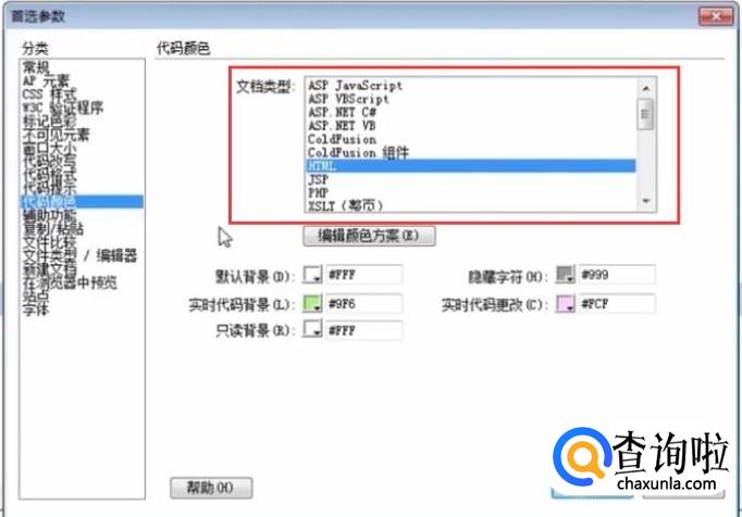然后我们再选择代码颜色参数,如下图所示,选择要设置的文档类型并设置文档颜色