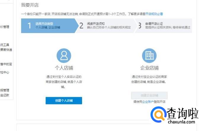 进入“免费开店”后,我们可以看到“个人店铺、企业店铺”,点击创建“个人店铺”进入。