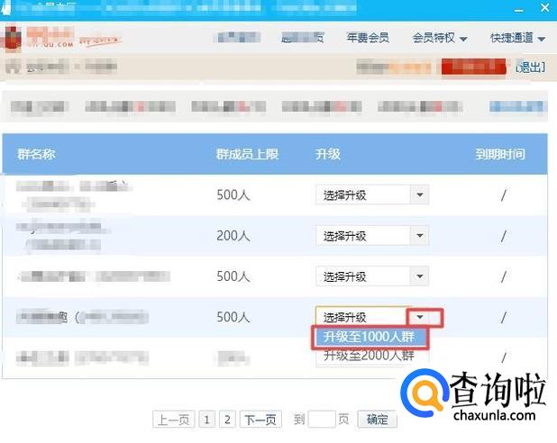之后我们找到该群,然后点击下拉箭头,弹出的界面,我们根据我们的需求选择一个进行升级,这样我们就提升QQ群人数了。