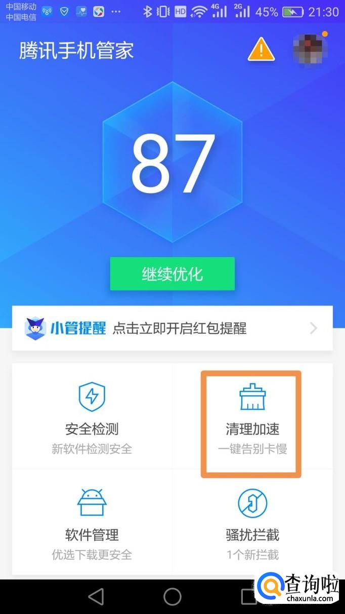 首页的“清理加速”是对占用内存、影响手机运行速度的垃圾文件和内容进行删除,点入进去之后就会对这些垃圾文件和内容进行扫描,扫描完毕一键清理就行。