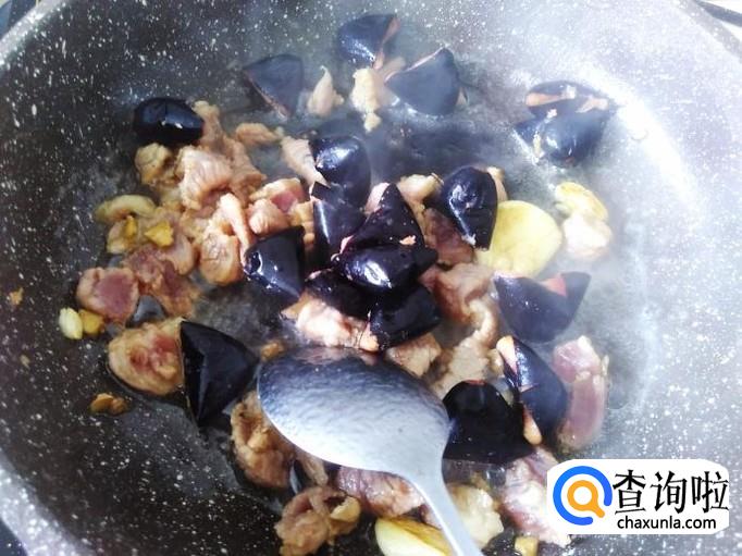 肉丁下锅,翻炒至变色。