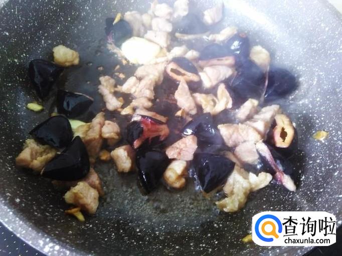 榄角下锅混合肉丁一起大火翻炒1分钟左右。