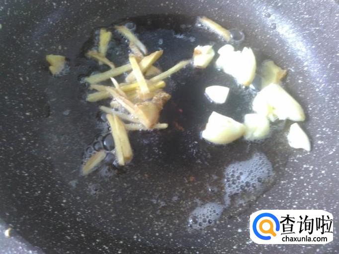 开火下油,放姜丝、蒜米进去爆香。