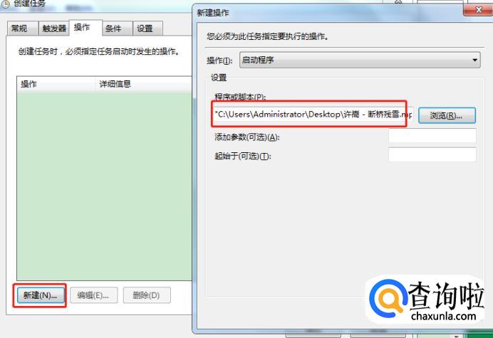 然后单击“操作”选项,单击“新建”,进入“新建操作”页面,在“程序和脚本”里面,点击选择自己之前挑选好的音乐,如图所示。