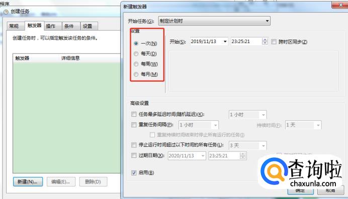 然后单击“触发器”选项,单击“新建”,进入“新建触发器”页面,设置频率和开始的时间,设置好以后点击“确定”。