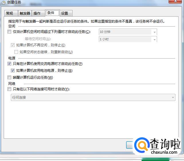 然后单击“条件”选项,进入“新建条件”页面,设置任务启动状态,设置好以后点击“确定”。如图所示。