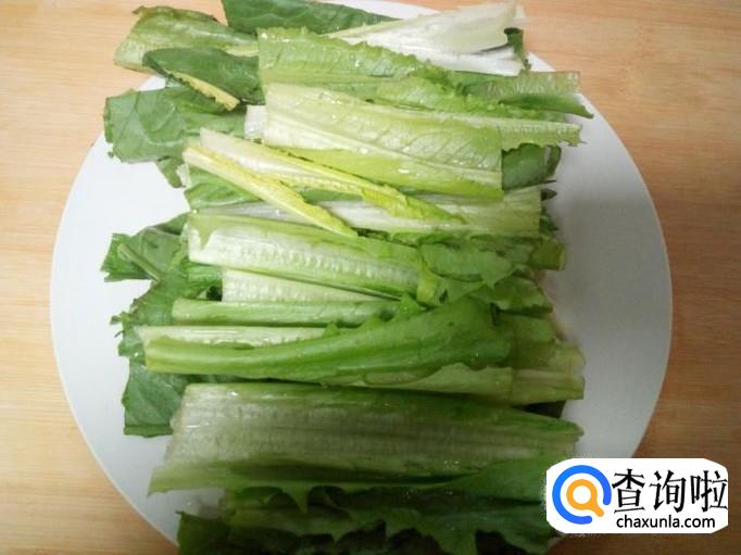 油麦菜收拾清洗干净,控干水分,切成段。