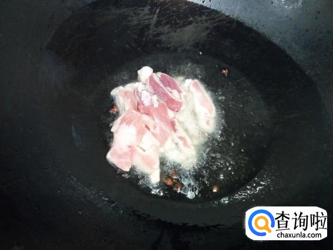 锅里放入油加热,油热后放入花椒爆锅,放入肉翻炒。