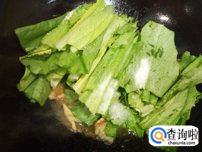 炒至鲜蘑变软,放入油麦菜翻炒,放入盐。炒至油麦菜断生,放入味精,关火出勺。
