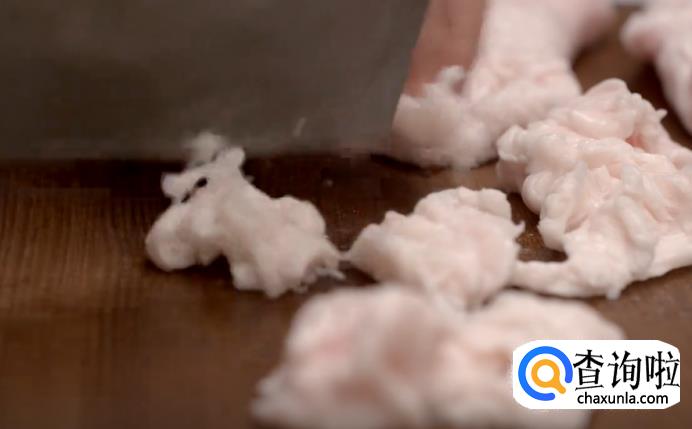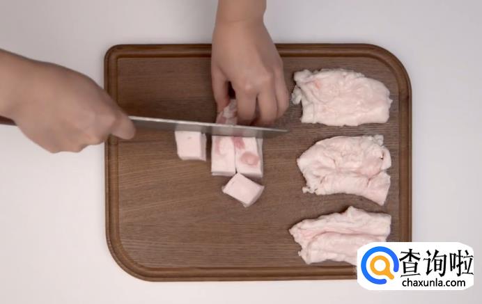 接着,将洗干净的肥肉切成小方块,再把板油切成碎块。