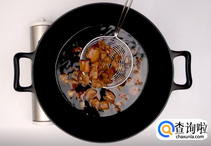 熬到肥肉和板油呈现焦糖色,把猪油渣沥出来,使锅里只剩下熬出的油。