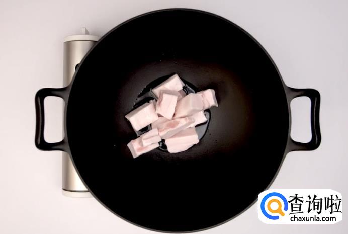 在冷锅的状态下,放入切好的肥肉,然后倒入适量冷水,直至没过底部。