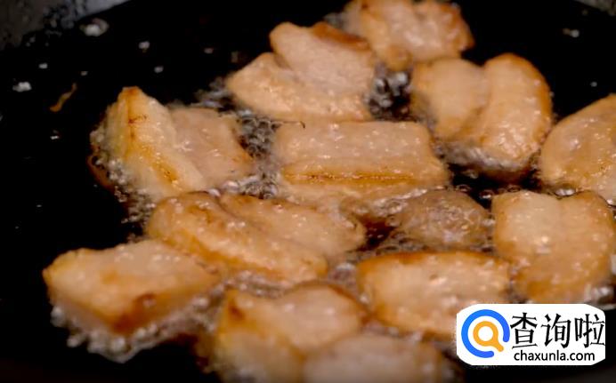 等到肥肉块表面呈金黄色的时候,加入板油,一起翻炒均匀。