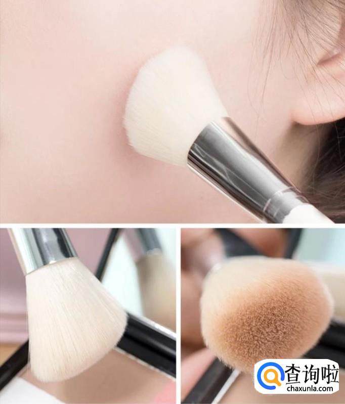 接着说说腮红刷,腮红刷也可以用来做修容刷,它的刷毛也很蓬松,但是它的形状是有点斜角的,有一个坡,这种斜角设计更好均匀涂抹