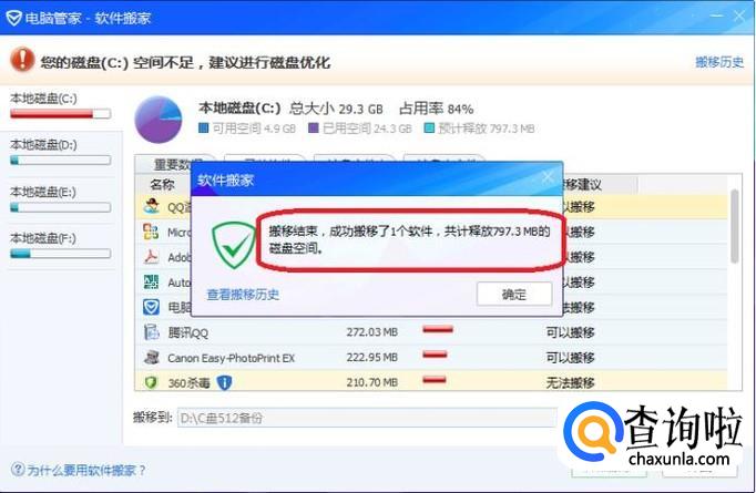 搬移可能会需要一些时间,搬移之后,系统会出现如图所示的提示,点击确定,就可以继续搬移其他软件了。