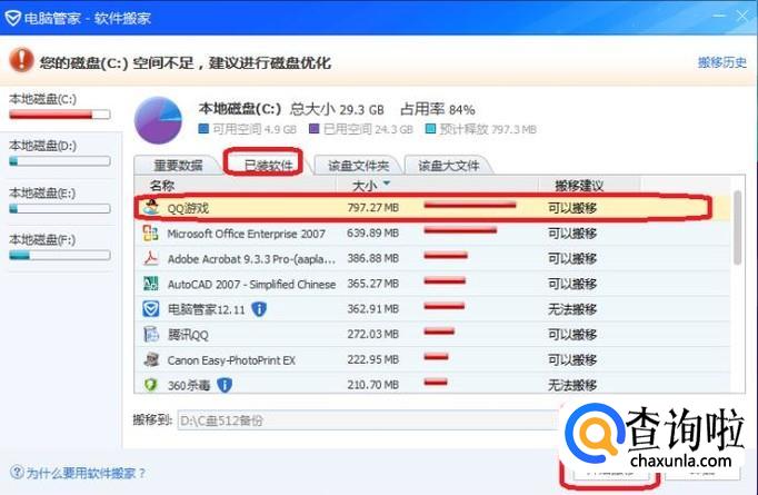 进入软件搬家,我们点击“本地磁盘”,“已装软件”,就看到可以搬移的软件了,我们点击其中一个软件QQ游戏试试,选中之后,点击选择位置,选一个其他盘内的文件夹,然后点击“开始搬移”。
