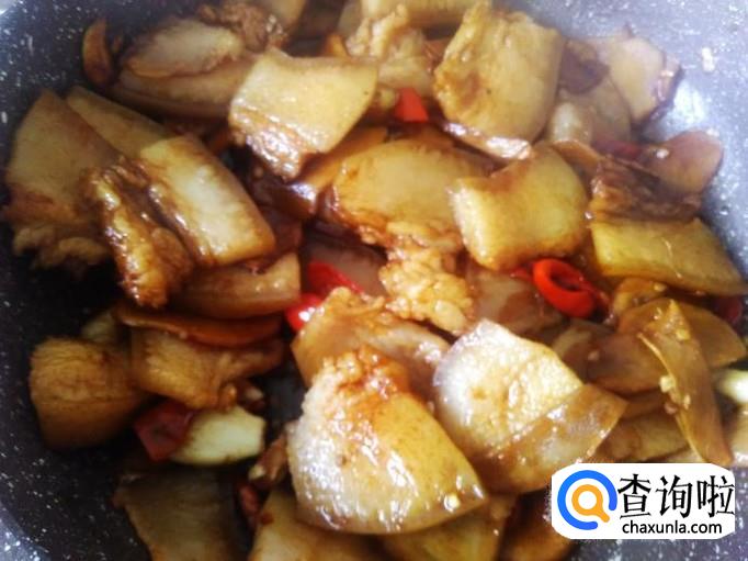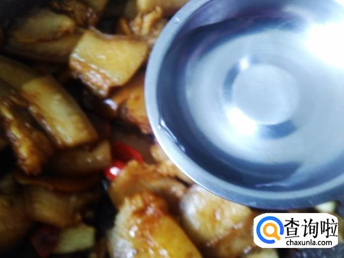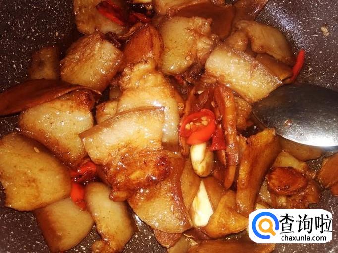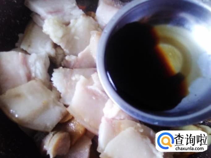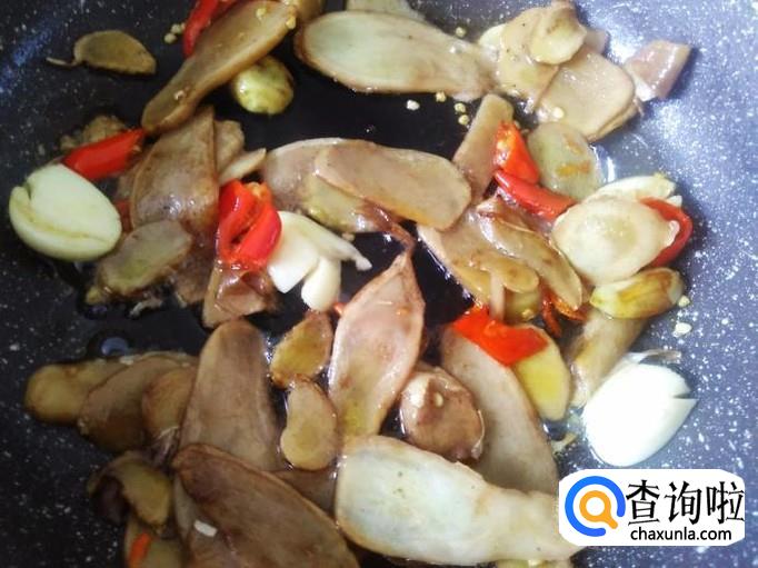 然后放姜片进去,加少量的生抽翻炒入味,再小火煎炸至变焦黄色。