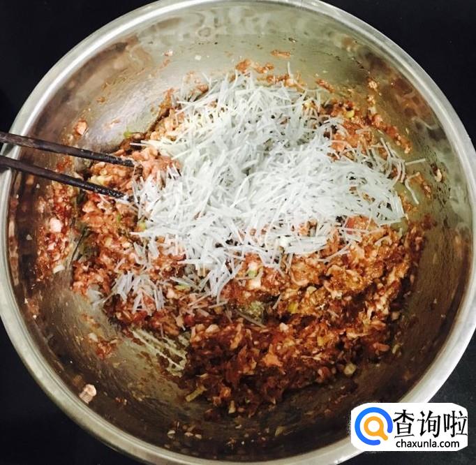 把切好的葱、姜末和粉条碎放入肉馅中搅拌均匀