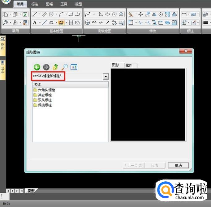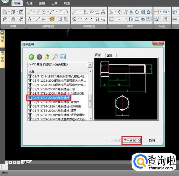 双击“六角头螺栓”进入最底层目录,这时选择对象就有预览图了,选中以后,点击下一步;