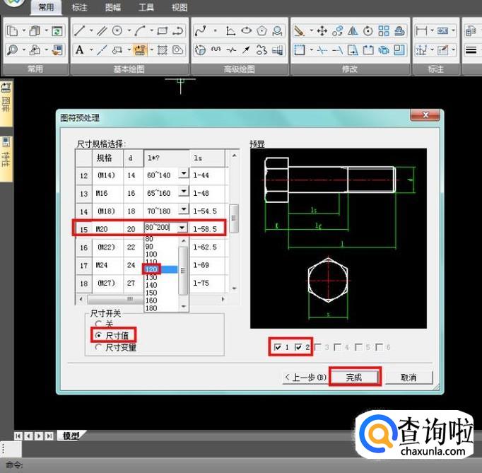 然后再选择该类螺栓的尺寸,是否标注尺寸,以及勾选需要调取的图形,选好以后,点击完成;
