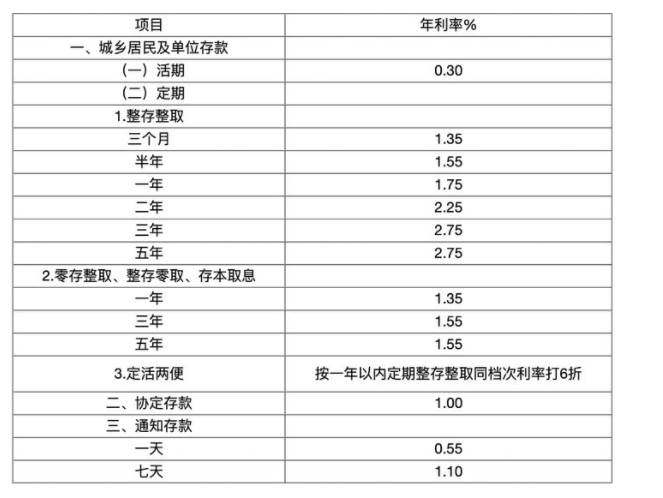 1.整存整取:三个月1.35半年1.55一年1.75二年2.25三年2.75五年2.75