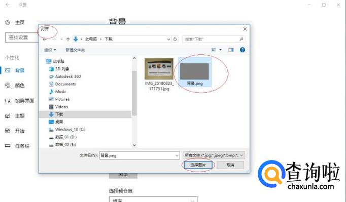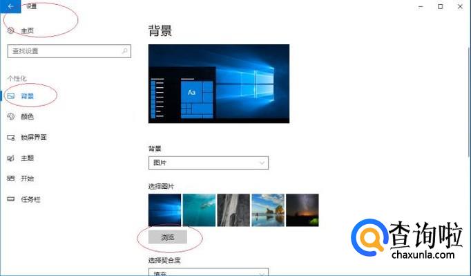 唤出"设置"程序窗口,点击"背景→选择图片→浏览"按钮。