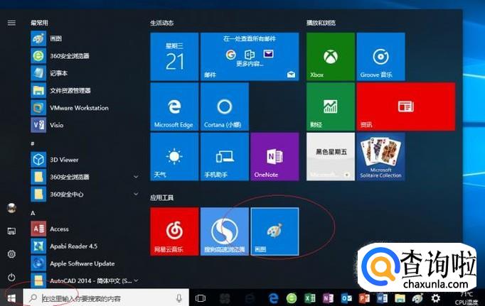 点击任务栏"开始"按钮,选择"画图"磁贴。