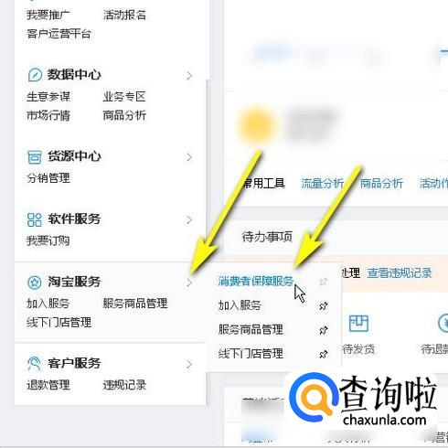 缴纳消保保证金的路径是,打开千牛工作台,在页面左侧导航这里,如图所示,找到淘宝服务;点击:消费者保障服务