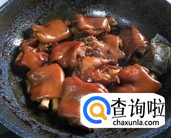 将猪蹄捞起,放入煎锅中煎制5分钟,加白酒,香油,老抽,翻炒3分钟左右,起锅。