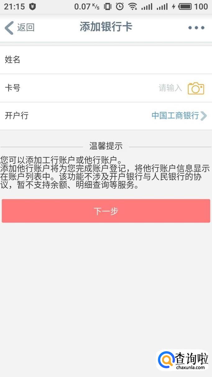 选择开户行之后,输入卡号即可自动判断卡种,点击“下一步”进行绑定即可。