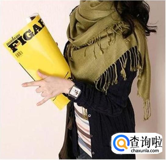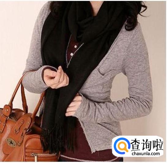 韩式披肩式围巾系法:也称八字系法,首先把中间分开把围巾两边交叉搭到背后,然后再在背后交叉搭到胸前来,再从胸前交叉搭到肩上