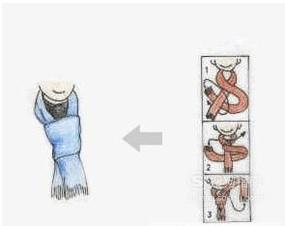 领带结系法:将围巾围上脖子,然后在右段如下图绕上一圈,再将右段从中间穿出,最后将右段插入结中