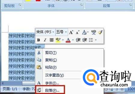 然后右击鼠标,点击段落,如下图所示。