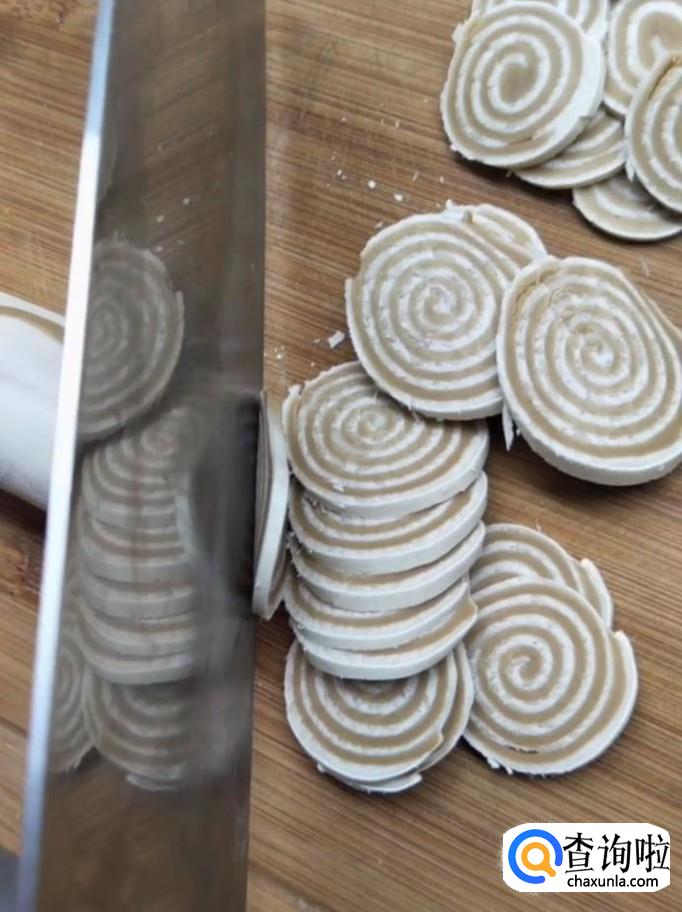 然后我们再把它擀一下,卷起来,放入冰箱冷藏一个小时左右,取出用刀切成一元硬币厚度的小片