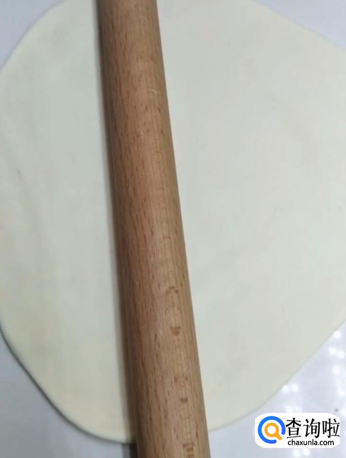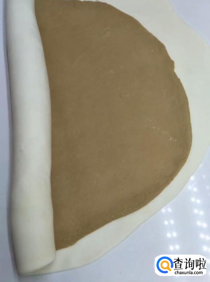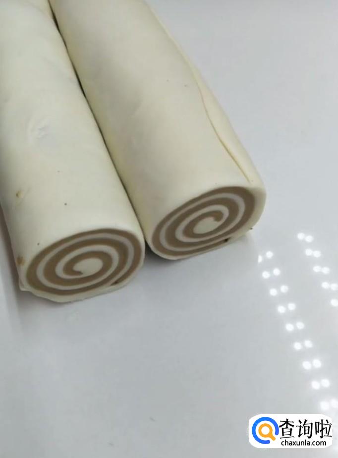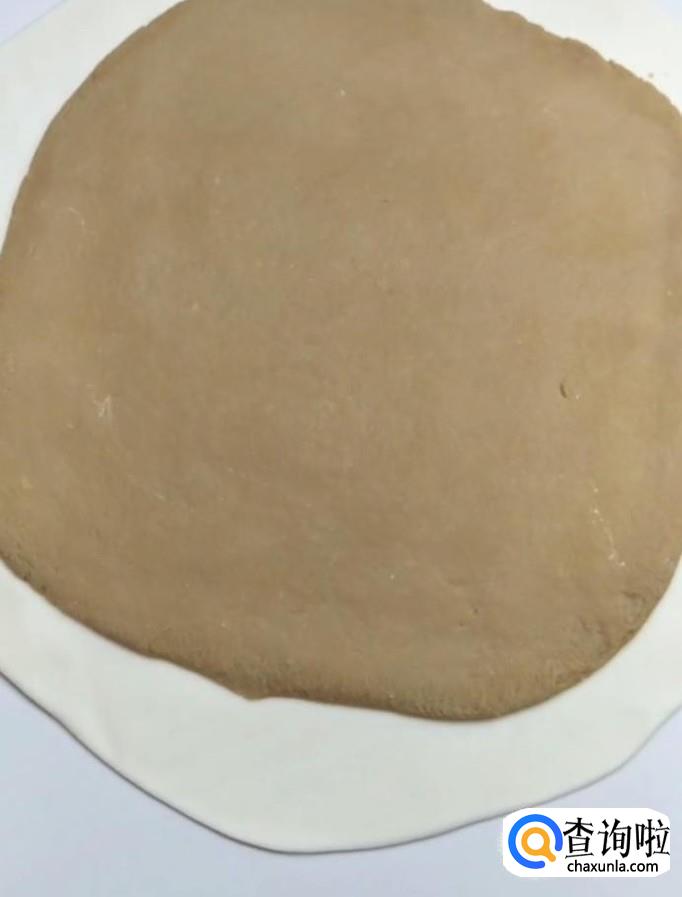 接着我们用擀面杖将两个面团分别擀成薄片,将红糖的面片放在牛奶的面片上面