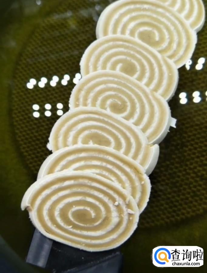 接着我们起锅烧油,油温五成热下入猫耳朵,开小火,炸至金黄酥脆飘起捞出控油