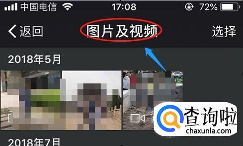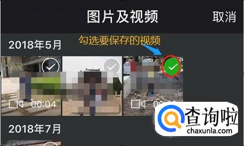 在“图片和视频”页面,我们首先点击右上角的“选择”,然后将我们打算保存的视频选中,小视频右上角有对勾说明为选中状态...