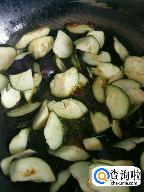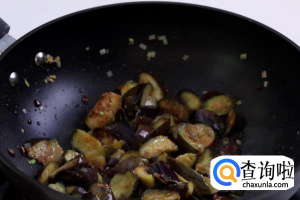另起锅,锅中放油三汤匙,油热后,先爆香葱末、姜末、蒜末、豆瓣酱,放入茄子,加绍酒、酱油后炒匀,再加入一碗水,大火煮开后改用小火煮至茄子入味,加入糖、醋调味,最后用湿淀粉勾芡即成