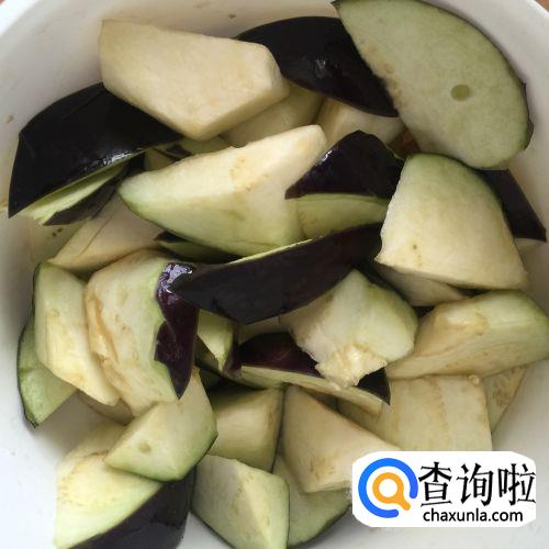 将茄子切成滚刀块;起油锅,锅中放入半锅油,待油热至八、九成时放入茄子,炸至茄子由硬变软时取出,将油沥干待用