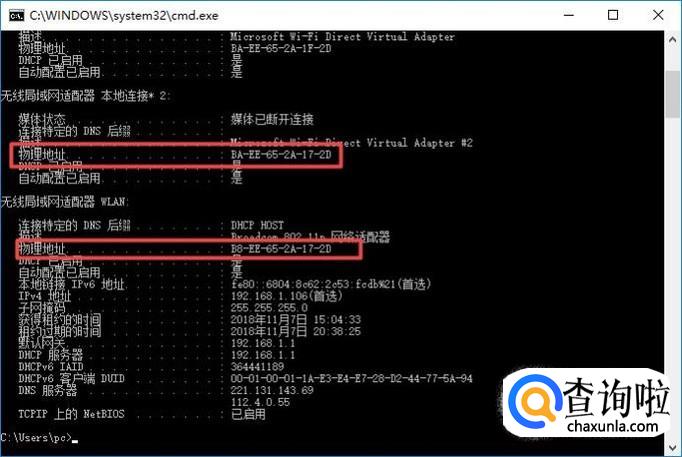 弹出的界面,图示中圈选出来的上方的就是电脑的Mac地址,下方的圈选是无线网络物理地址。